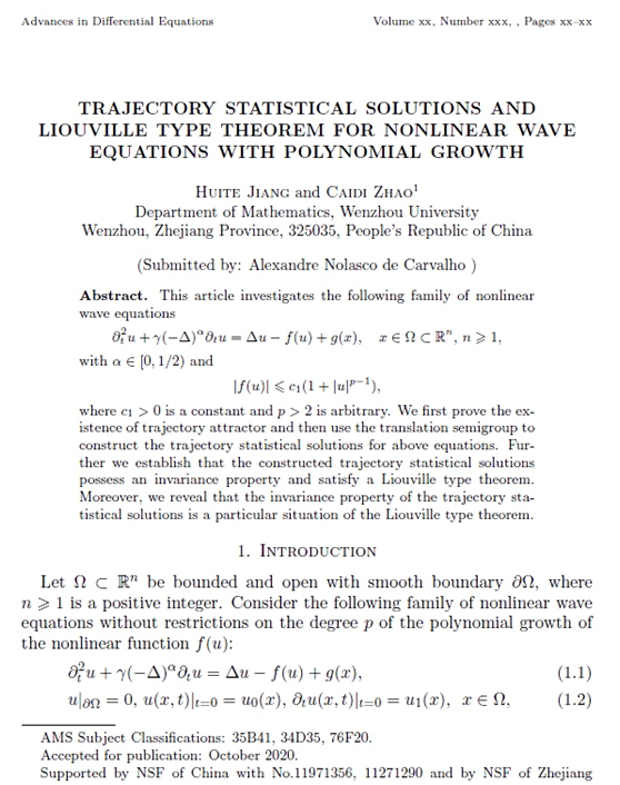 近日,日本色情片 数理学院19级数学专业研究生姜慧特以第一作者身份在国际微分方程领域权威期刊《Advance in Differential Equations》(微分方程进展)发表科研论文“Trajectory statistical solutions and Liouville type theorem for nonlinear wave equations with polynomial growth”(带有多项式增长的非线性波动方程的轨道统计解与Liouville型定理)。