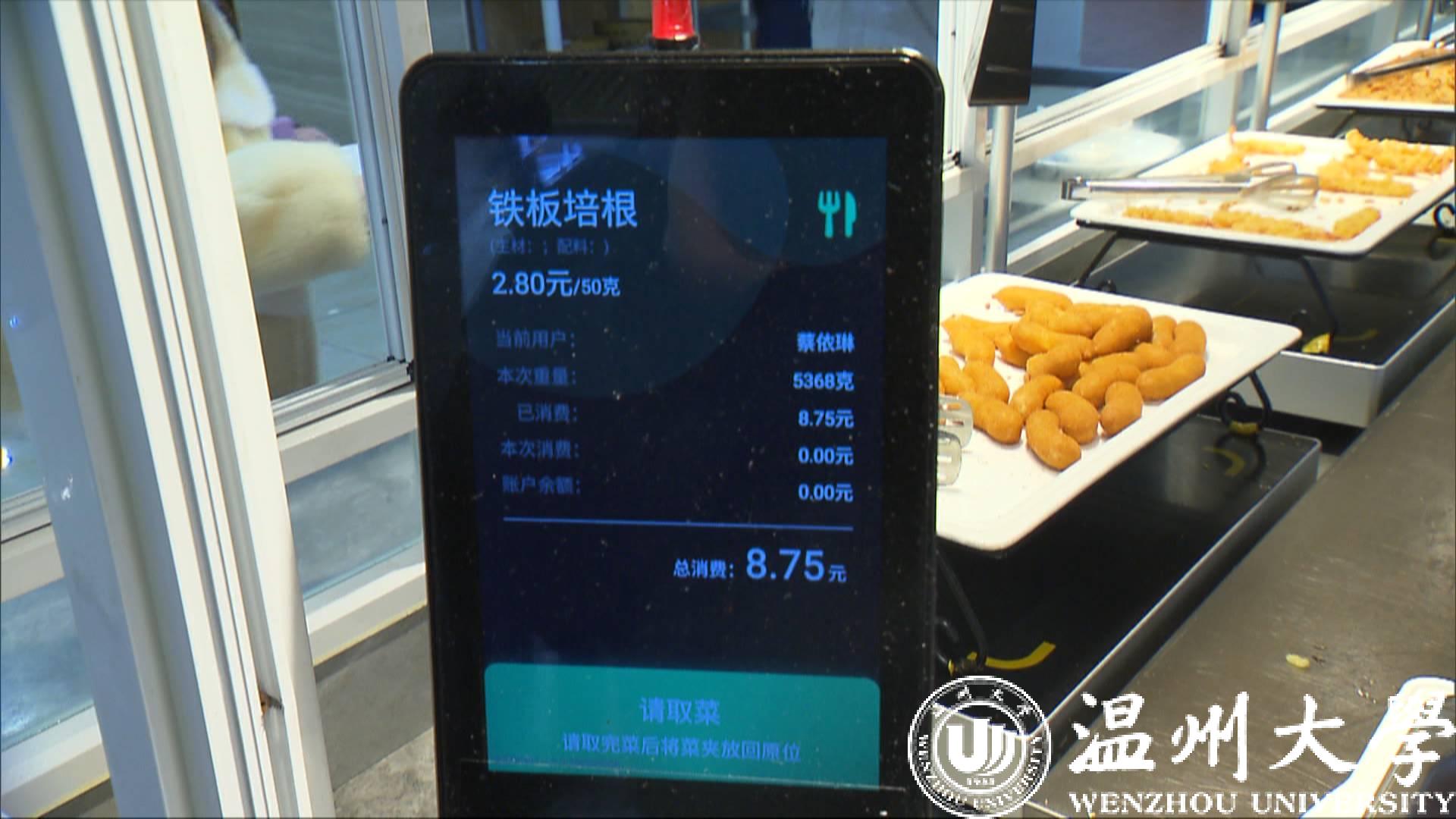 相比传统食堂,温大的智慧餐厅更像一个星级酒店的自助餐厅。在餐厅门口拿餐盘和一个带二维码的托盘,用手机微信或者支付宝扫描二维码完成首次绑定,然后就可以根据自己的喜好挑选菜品。每个菜品旁边都有一块液晶显示屏,托盘放在感应区内,夹菜之后,显示屏就会显示对应的菜名、重量、价格等信息。用餐者可以根据自己的需求适当增减,系统会及时根据你选择的菜量和菜价,自动结算这一餐的费用。