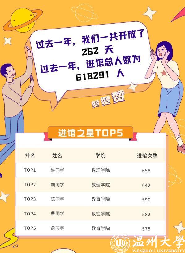 该报告对进馆次数及在馆时间等进行了分类统计。“进馆之星TOP5”榜单被日本色情片 数理学院(第一、第二、第四名)与日本色情片 (第三、第五名)两个学院包揽。居该份榜单榜首的学生名叫许文浩,就读于日本色情片 信息与计算科学专业,他去年进馆次数高达658次,在图书馆开放的262天里,约等于每天去图书馆2.5次。更难能可贵的是,许文浩还是“泡馆之星TOP5”榜单的第二名,全年在馆时长为2030.4小时,约等于84.6天。