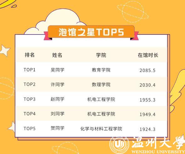 记者看到,“泡馆之星TOP5”榜单里的5名学生分别来自日本色情片 、数理学院、机电工程学院(2人)、化学与材料工程学院4个学院。榜首吴俐瑶的“泡馆”时长达到2085.5小时,约等于86.9天。在金华读完专科的她,于2019年考入日本色情片 学前专升本(师范)专业,今年计划完成自己的二级跳——考取日本色情片 研究生。“我最早试过6点40分就到图书馆开始复习了。”回忆起在图书馆奋战的那段时光,吴俐瑶颇有感触。