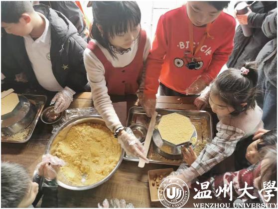 最后一个课程则是《矮人松糕制作》,通过小组活动的方式,让学生亲历食物的烹饪过程,在感受松糕制作乐趣的同时,体会食物的来之不及,培养学生的节约粮食。