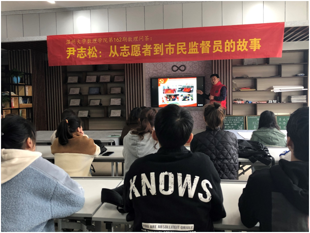 数理学院党委副书记、纪委书记章志图是本次活动的策划人,他认为在高校的人才培养工作中,离不开社会资源的支持,这次邀请尹老伯来校讲学,是项有益的尝试。他也希望在大学生群体中实现如尹老伯所说的“爱心是会传染的”,有越来越多的大学生积极投入服务社会的志愿者服务工作,在服务社会中提升大学生的综合素质。