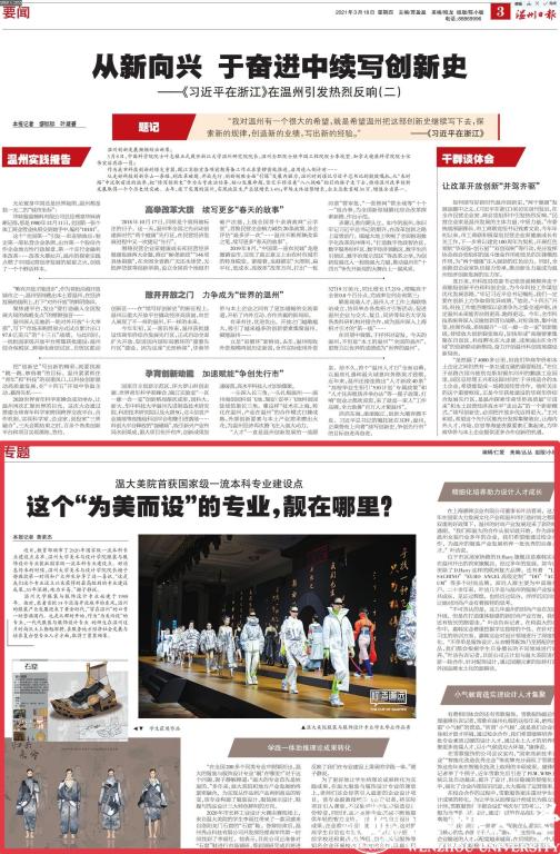 “在全国200多个同类专业中脱颖而出,温大的服装与服饰设计专业‘靓’在哪里?”对于这个问题,谢子静解释道:“温大的专业首先是姓温的。”多年来,温大美院和地方产业发展始终紧密融合。为实现从作品到产品再到商品的转变,该专业构建了服装设计、服装展示设计、鞋履与饰品设计三大特色鲜明的方向。