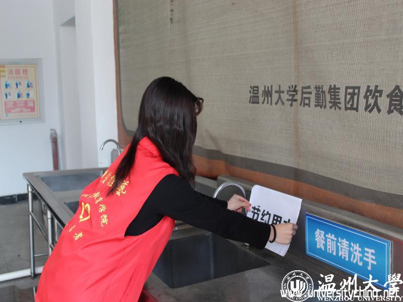 节约用水并非一朝一夕,为使节水理念深入校园,志愿者们还分散到各个生活区的食堂、商场内,在洗手台、走廊等醒目处张贴节约用水标志,让节水一词不离生活,触手可及,提醒所有人在日常生活中做到珍惜点滴。