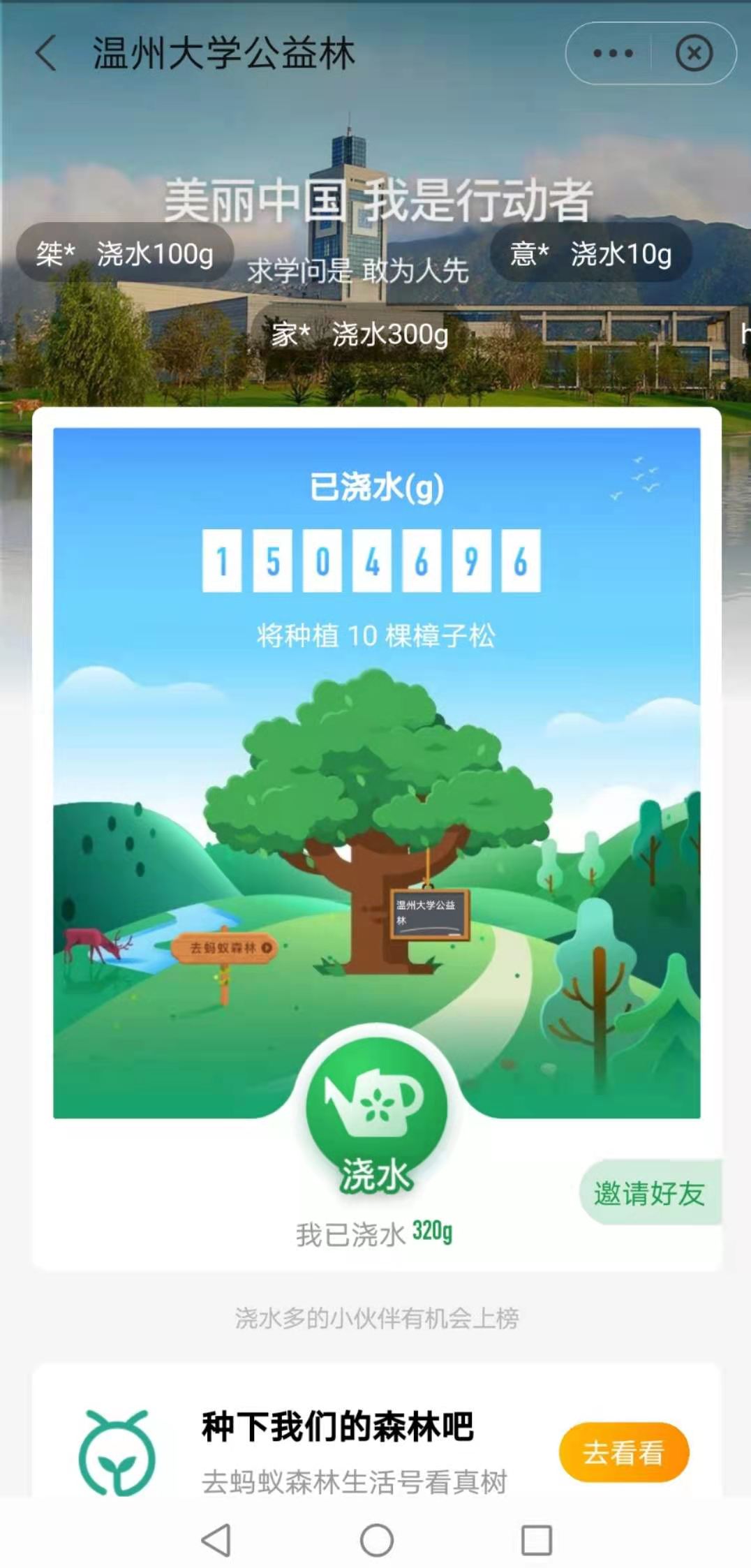 此外,生环学院的师生们还在网络上发起“云植树”的号召,依托支付宝的蚂蚁森林平台,鼓励全校师生为“日本色情片 公益林”浇水,做建设美丽温大、美丽中国的践行者。