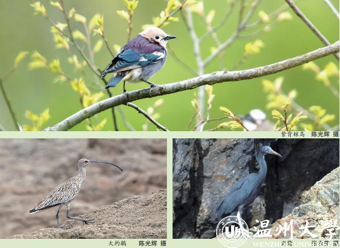 据悉,本次调查共发现鸟类72种,其中岩鹭、大杓鹬、凤头鹰、游隼、灰脸鵟鹰、普通鵟等6种为国家二级重点保护动物,另有紫背椋鸟、黑眉柳莺等罕见鸟种。“紫背椋鸟在温州乃至浙江都很少见,在中国大陆记录也不多,属于罕见鸟。只有在春秋迁徙季节才会经过我国东部岛屿及沿海地带,夏季繁殖于日本,冬季在台湾以及菲律宾一带越冬。”张永普教授介绍。除了岩鹭与大杓鹬外,列入全球易危物种的硫黄鹀也同时记录到了6只,该鸟分布狭窄,沿着岛屿和海岸线迁徙,繁殖于日本。