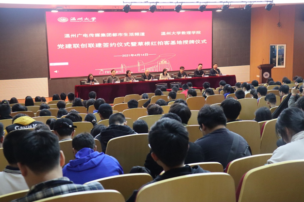 签约仪式后,双方党支部随即举行第一场联建活动——《草根红拍客》基地授牌仪式。鹿城区委宣传部朱丽华、温州广电传媒集团陈淼两位领导亲自授牌,并宣布温大数理学院成为我市第八家、高校首家《草根红拍客》基地。朱丽华认为,该基地的建成将有利于温大数理学院第一时间向社会展示办学成果,为温州“数学家之乡”品牌建设增色。随后,《草根红拍客》栏目编导陈品熹开设了《融媒体时代如何成为一名优秀的拍客》专题讲座,指导温大数理学院师生利用手机工具讲好温州“数学家之乡”的故事。