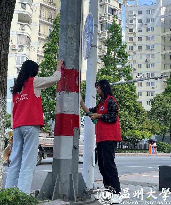 “生命曙光”青年志愿者服务中心志愿者们清除电线杆广告纸