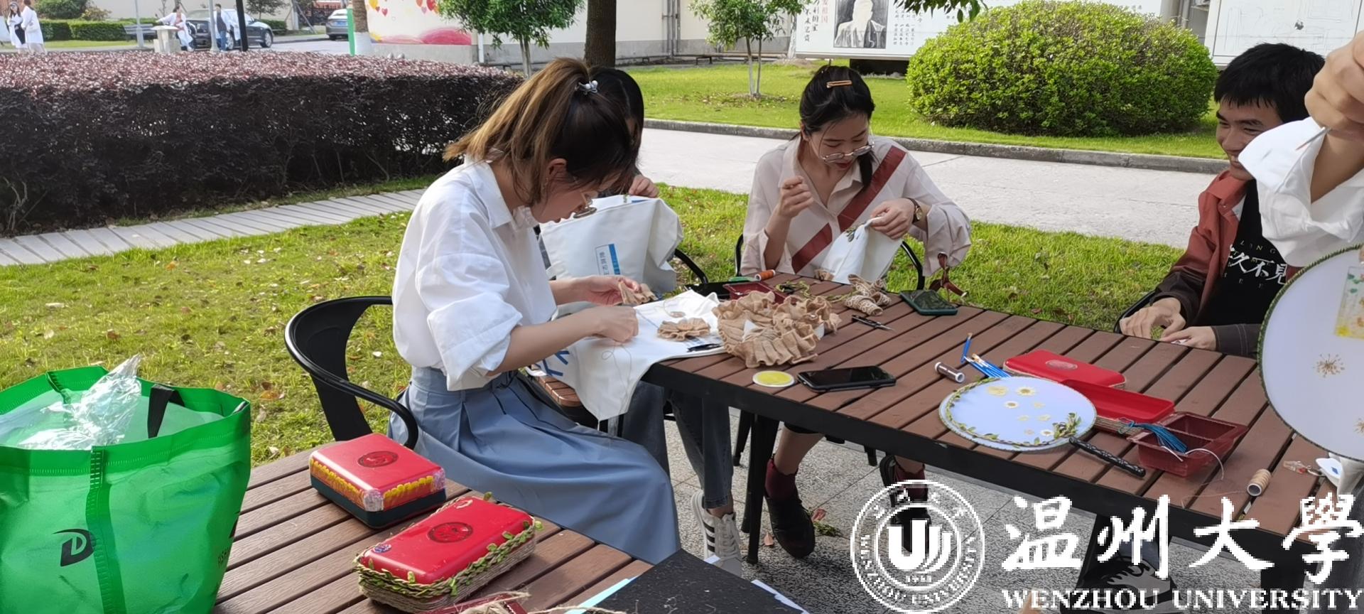 手绘环保袋、编织礼品盒、手工绣团扇......不少路过的同学为之吸引并自发其中,越来越多的旧物被改造,焕发了全新的生命力。