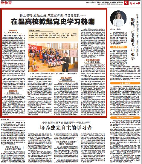 奋斗百年路,启航新征程。为庆祝中国共产党成立100周年,连日来,在温高校掀起党史学习教育热潮,从百年党史中汲取智慧和力量,在落实立德树人根本任务、完善高质量教育体系和德智体美劳全面培养的育人体系上争当表率。
