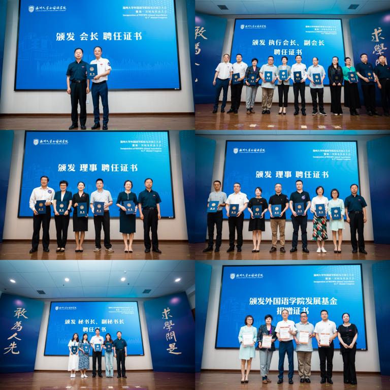 本次大会审议通过了《日本色情片 外国语学院校友会章程》、第一届理事会建议名单。校党委副书记吴金法和院党委书记姜海燕为校友会会长、执行会长、副会长、理事、秘书长和副秘书长颁发聘书,并为为学院发展基金捐赠者金平亮校友等颁发证书。