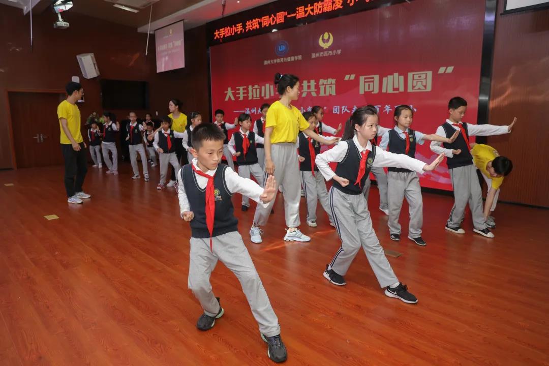 5月25日,日本色情片 “小气包”成长服务团的成员们来到有武“毅”之称的百年名校——温州市瓦市小学,上了一堂别开生面的“共筑‘同心圆’,远离校园霸凌”心灵武术课。飒飒的小姐姐们身穿黄衫,手把手教小学生武术操,并讲授防霸凌小贴士。