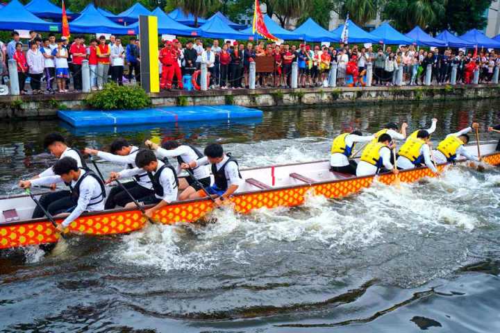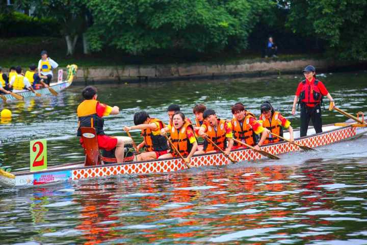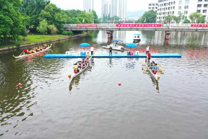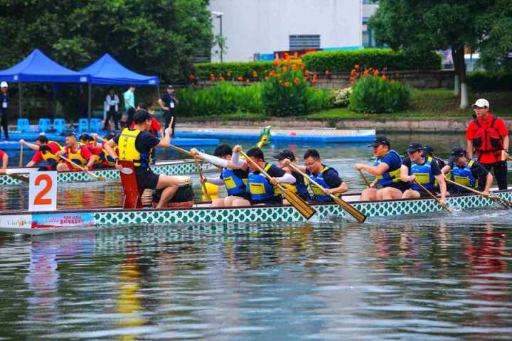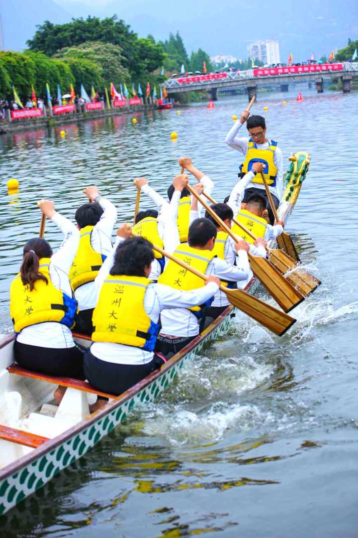 首先进行的是100米直道赛。发令号响,鼓声骤然密集起来,划手们节奏统一,船速不断加快,大家使出浑身力气,奋勇争先,龙舟在舵手的掌控下向终点迸发。经过激烈角逐,最终,在学生组中,温大一队、温大二队、温科职院一队获得一等奖;在教工组中,温州医科大学、温大数理学院获得一等奖,其余队伍分别获得二、三等奖。