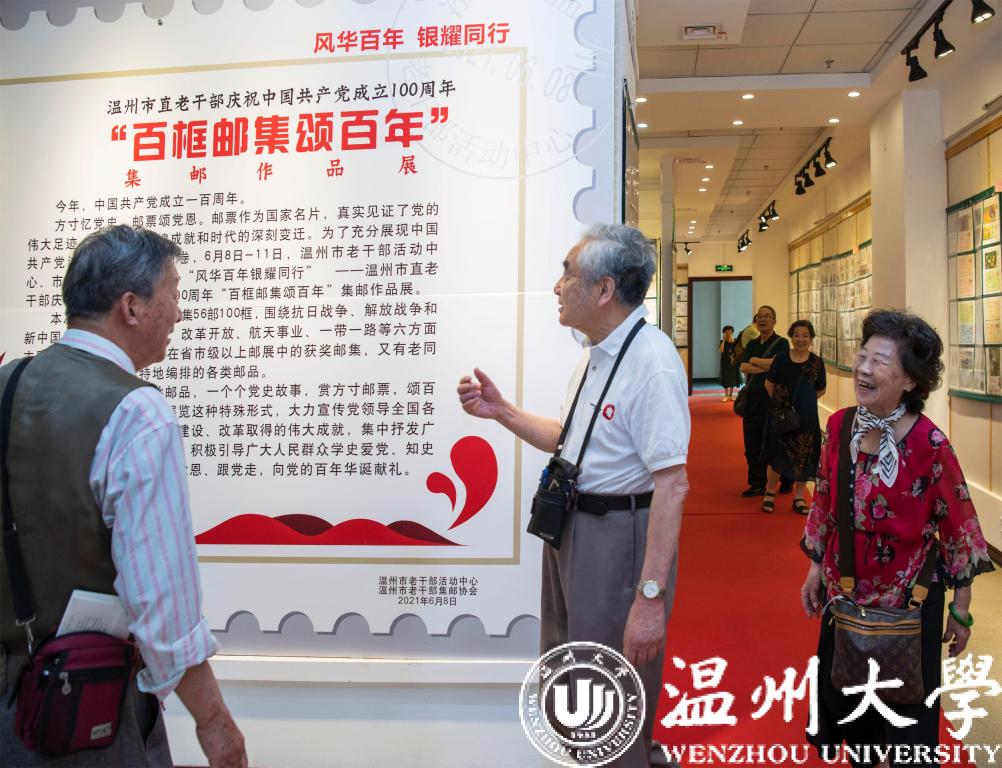 6月8日上午,由温州市老干部活动中心、市老干部集邮协会举办的“‘风华百年 银耀同行’——温州市直老干部庆祝中国共产党成立100周年‘百框邮集颂百年’集邮作品展”在市区蛟翔巷温州市老干部活动中心一楼展厅展出。本次集邮作品展围绕抗日战争、解放战争和新中国成立以后经济建设、改革开放、航天事业、一带一路六方面主题,共展出市老干部集邮协会30名会员精心编排的56部112框邮集。