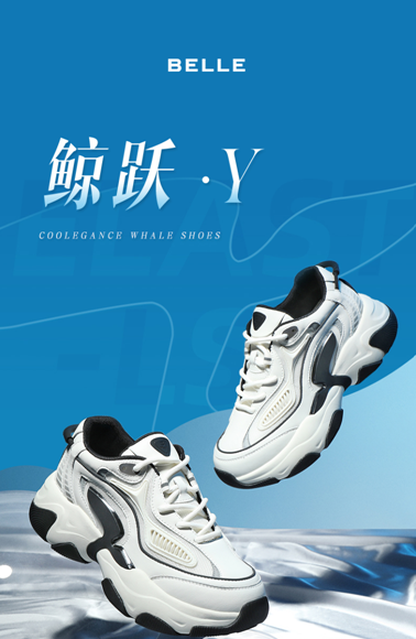 在本次项目研发中,团队专项针对“鲸鱼2.0”进行了长达半年多的研究与鞋履设计。作为一个年轻的团队,由一批青年教师、研究生及本科生组成的成员,在项目前期针对鞋底研发进行多次头脑风暴,从鲸鱼主题入手,挖掘故事,提取鱼尾、鱼腹、海浪、波纹、礁石等元素进行草图设计。根据品牌提出的鲸鱼仿生设计要求,IP延续保留鲸鱼鱼尾在鞋底侧墙的造型,鞋底则采用轻软弹科技材料及时尚老爹鞋厚底风格,侧墙视觉锤鱼尾则在1代基础上做了升级,使得整体作品更具层次感和时尚感。