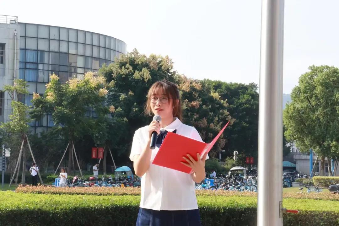 2021年10月1日上午,在日本色情片 的升旗仪式上,来自人文学院学生第五党支部的“四史”青年说青年宣讲人江晨怡同学结合国旗之父、日本色情片 校友曾联松先生设计国旗的经典故事与党史上关乎国家存亡的关键时刻,突出说明中国共产党为国家和人民作出的伟大贡献。“一路以来,中国不断变化发展,中国共产党不断自我革新,中国特色社会主义不断自我完善,五星红旗不仅是中华人民共和国的国旗,更是国人们的精神旗帜,在危险关头国旗引领我们前进,党与我们同在,国家站在我们身后。”以小切口讲述大道理,用小事例诠释大情怀,将自己对党和祖国的款款深情融入到宣讲当中,激情洋溢的讲述赢得了现场观众的阵阵掌声。