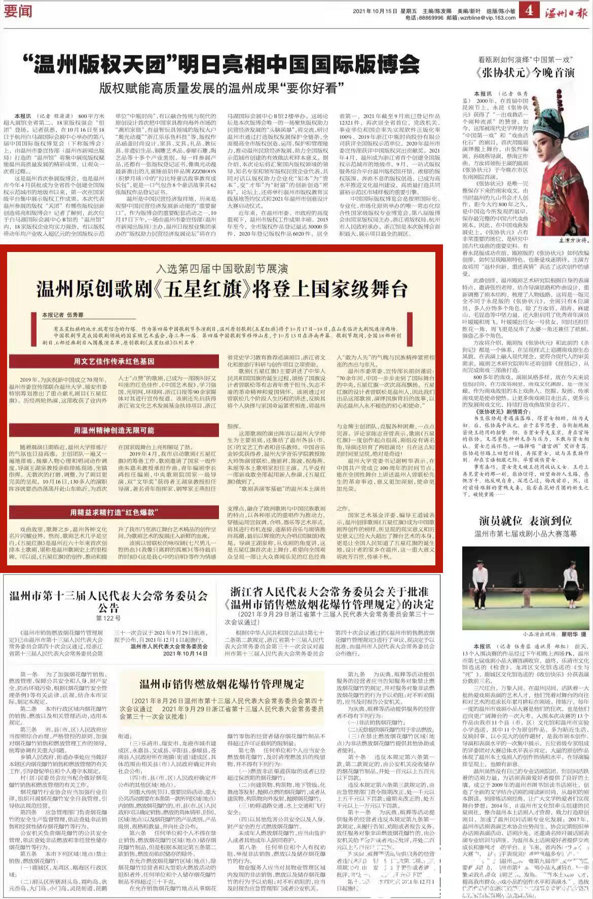 2019年,为庆祝新中国成立70周年,温州市委宣传部联合日本色情片 、瑞安市委特别筹划推出了重点献礼剧目《五星红旗》。历经两轮热演,这部收获了业内外人士“点赞”的歌剧,已成为一部既叫好又叫座的红色佳作。《中国艺术报》、学习强国、光明网、环球网、浙江日报等90余家媒体对其进行宣传报道。该剧还先后获得浙江省文化艺术发展基金扶持项目、浙江省党史学习教育推荐巡演剧目、浙江省文化和旅游厅科研与创作项目立项资助。