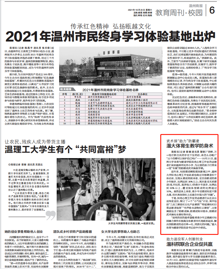 于是,阳光心理工作室的志愿者们从社会公益角度出发,制订了一个“小气包”计划,其中包括“三点三课堂和文化产品销售”“特定课程和日常志愿者服务”“有声绘本读物和云课堂”,这里面就包含了防霸凌操、防霸凌知识绘本、防霸凌武术操校本课程等内容。“最终的目的是希望能将青少年正确面对校园暴力事件和提高身体素质有机地联系起来,解决预防霸凌的途径单一化、同质化的问题。”温大体育与健康学院党委书记应中介绍说。