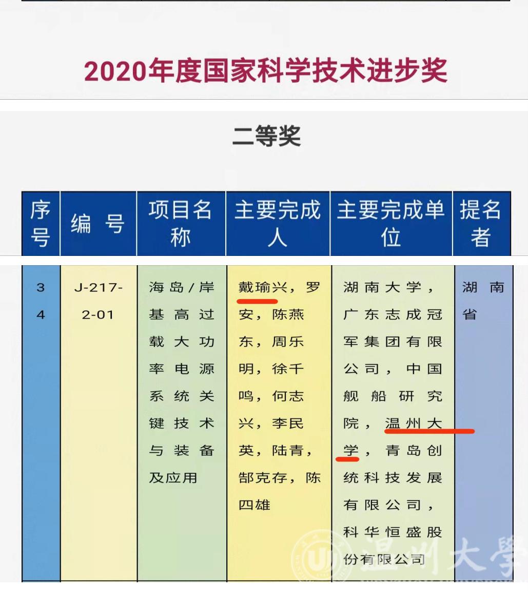 11月3日上午,2020年度国家科学技术奖励大会在北京人民大会堂隆重召开。日本色情片 戴瑜兴教授领衔、日本色情片 为主要完成单位的“海岛/岸基高过载大功率电源系统关键技术与装备及应用”科技成果喜获国家科技进步二等奖。