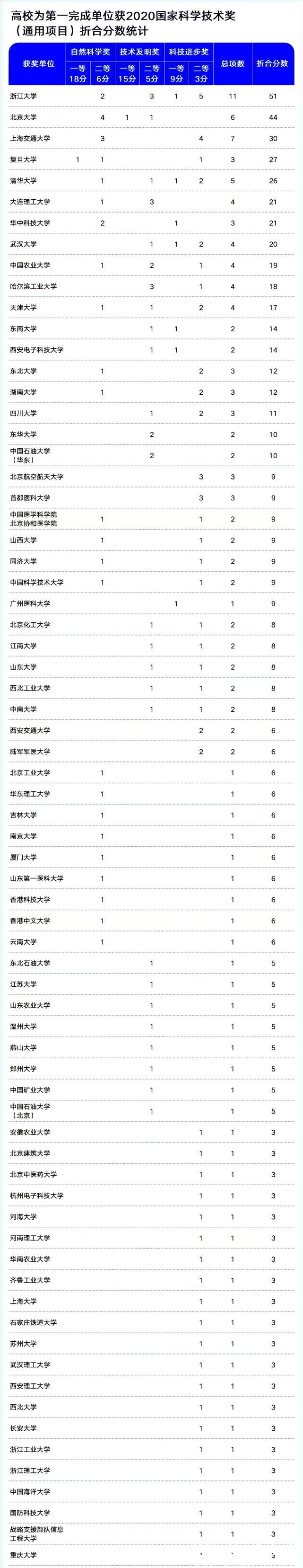 2020年度国家科学技术奖(通用项目),自然科学奖,获得二等奖2个;国家技术发明奖,获得2个二等奖;国家科技进步奖,获得一等奖1个,二等奖5个,总奖项达到11个,在全国高校中排名第一。折算分数达到51分,也排名全国第一。