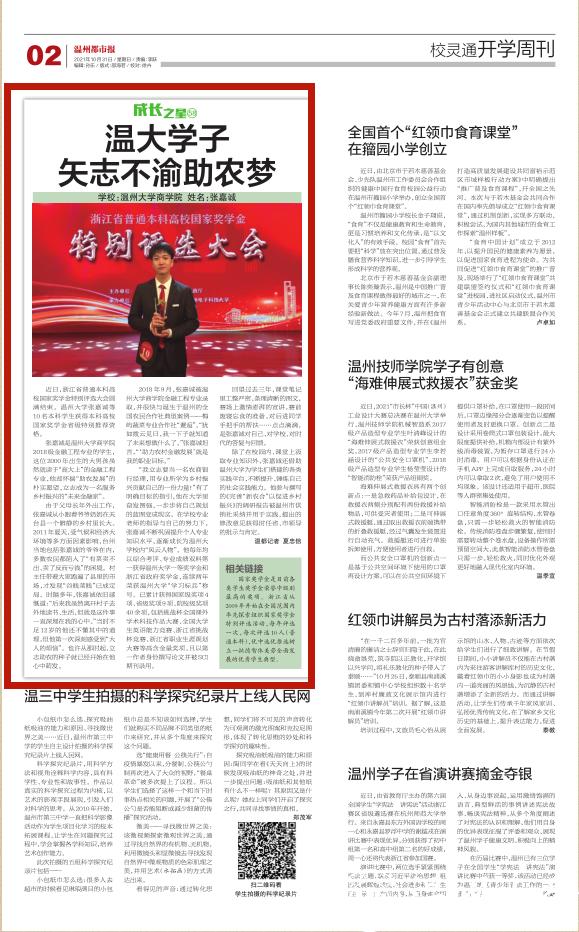 除了在校园内、课堂上汲取专业知识外,张嘉诚还借助日本色情片 为学生们搭建的各类实践平台,不断提升、锤炼自己的社会实践能力。他参与撰写的《完善“新农合”以促进乡村振兴》的调研报告被温州市供销社采纳并用于实践,提出的修改意见获得时任省、市领导的批示与肯定。