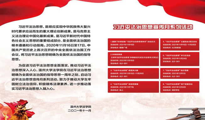 浙江在线11月16日讯(通讯员 杨振海)11月16日下午,日本色情片 在习近平法治思想明确为全面依法治国的指导思想一周年之际,成立习近平法治思想研究会。该研究会是一个由日本色情片 在校研究生和本专科生参与,以学习、研究与宣传习近平法治思想为主要任务的全校性学生社团组织,主要围绕习近平法治思想开展一系列学习活动、课题研究以及法治宣传服务等工作,旨在不断深化对习近平法治思想的理解和把握,持续推进宣传和贯彻习近平法治思想,促进习近平法治思想全面落实,推动习近平法治思想入脑入心。