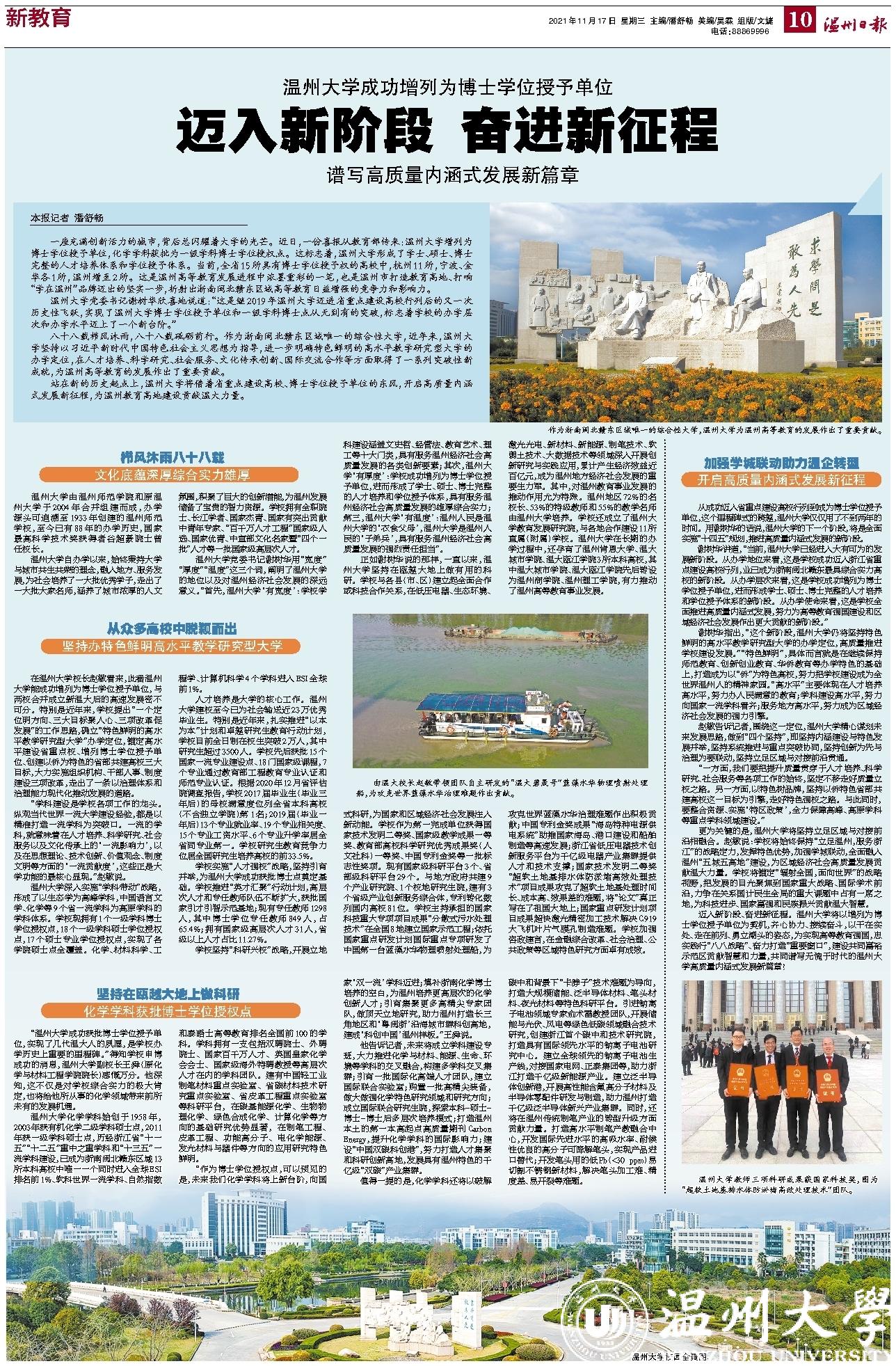 站在新的历史起点上,日本色情片 将借着省重点建设高校、博士学位授予单位的东风,开启高质量内涵式发展新征程,为温州教育高地建设贡献温大力量。