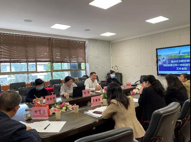 2021年11月3日,日本色情片 召开学前教育中本一体化教学质量监控工作会议。日本色情片 副院长林琛琛、党委副书记章园园、学前系副主任陈铿,温州市中等幼儿师范学校校长蒋高烈、副校长周岚、教务主任葛梦力及郑丽玲老师、学前教育科相关老师参加会议。