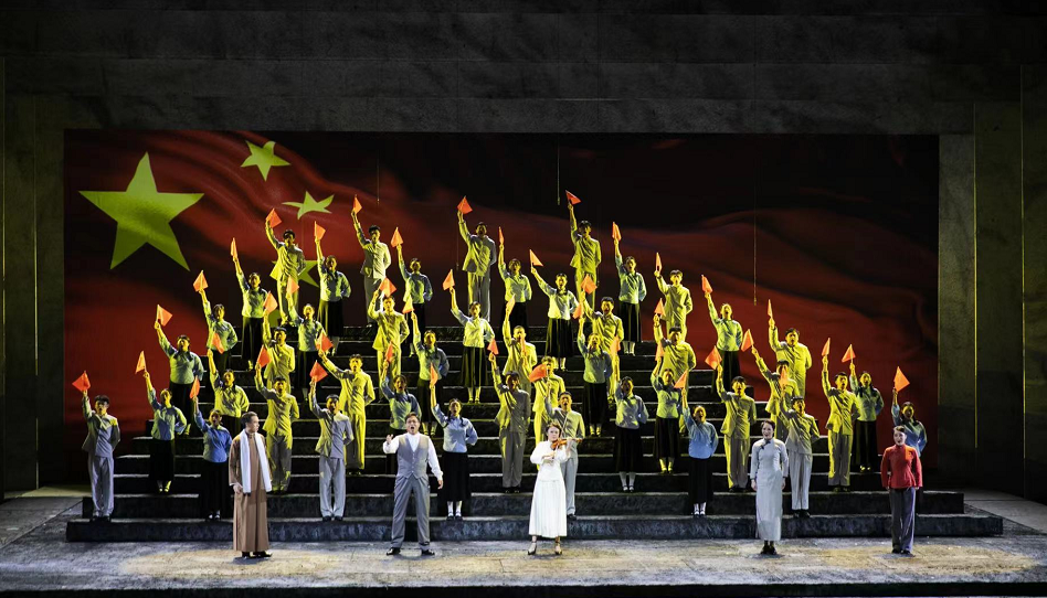 以歌剧的形式讴歌一国之旗,世界国旗史和歌剧史也不多见。歌剧艺术有着天然的高贵和华丽,有人说音乐是流动的建筑,而歌剧是这座建筑中最辉煌的大厅。也有人说歌剧是集中了文学、戏剧、美术的各类高雅艺术的音乐艺术皇冠上的一颗璀璨的明珠。歌剧《五星红旗》把源自西方的高雅艺术和庄严的中国国旗联姻,用独唱、合唱、重唱各种演唱形式,发挥咏叹的抒情,重唱的立体、乐队的情感渲染和气氛烘托。全剧以咏叹为支点,宣叙为链条, 合唱、重唱为穿插,努力实现原创歌剧《五星红旗》中国与世界、传统与现代、音乐与历史的多重融合,重磅体现国家精神和国家价值,再次泛起音乐原本是早期人类集体意识的历史起源。