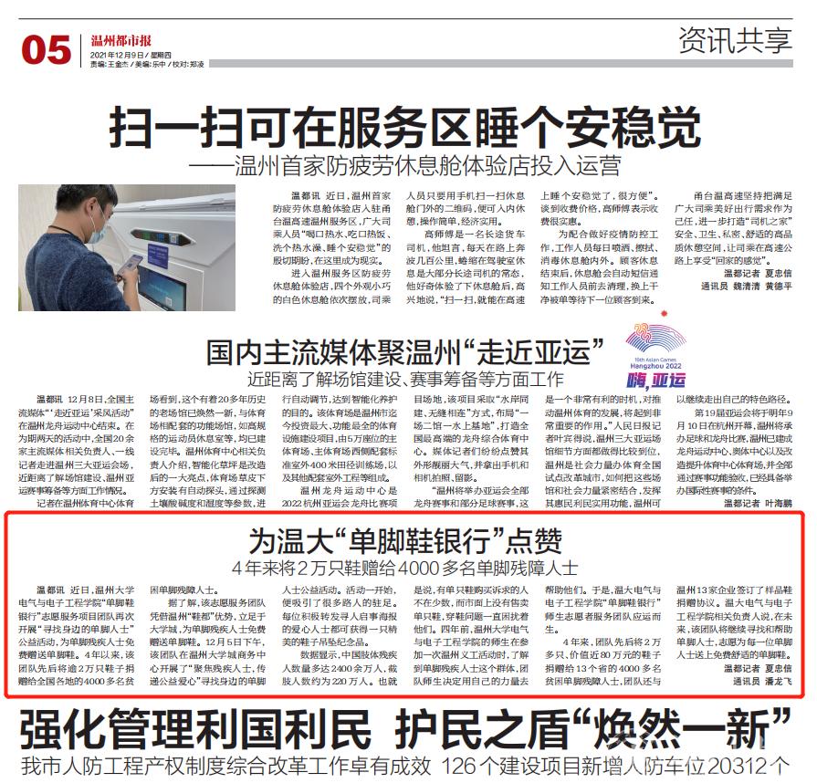 近日,日本色情片 电气与电子工程学院“单脚鞋银行”志愿服务项目团队再次开展“寻找身边的单脚人士”公益活动,为单脚残疾人士免费赠送单脚鞋。4年以来,该团队先后将逾2万只鞋子捐赠给全国各地的4000多名贫困单脚残障人士。