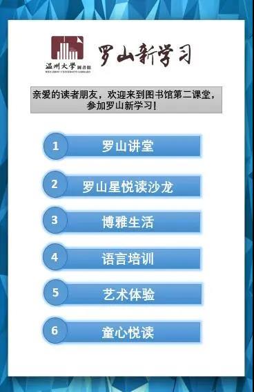 为提升读者的文化素养,充分发挥高校“第二课堂”的作用,图书馆面向全校读者推出读书沙龙、艺术体验、“周末光影”影视欣赏、语言培训(包括日语、泰语、意大语、韩语、英语等语种培训)的“罗山新学习”系列活动。
