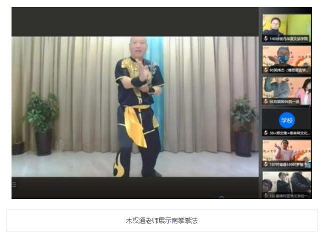 木权通老师从五祖拳最基础的起手式开始,一个动作一个动作地示范给学生们看。远在西班牙的学生们通过摄像头跟随木权通老师一招一式地练习。一些学生表示,等疫情过去后一定要到中国拜访木老师,继续学习南拳。