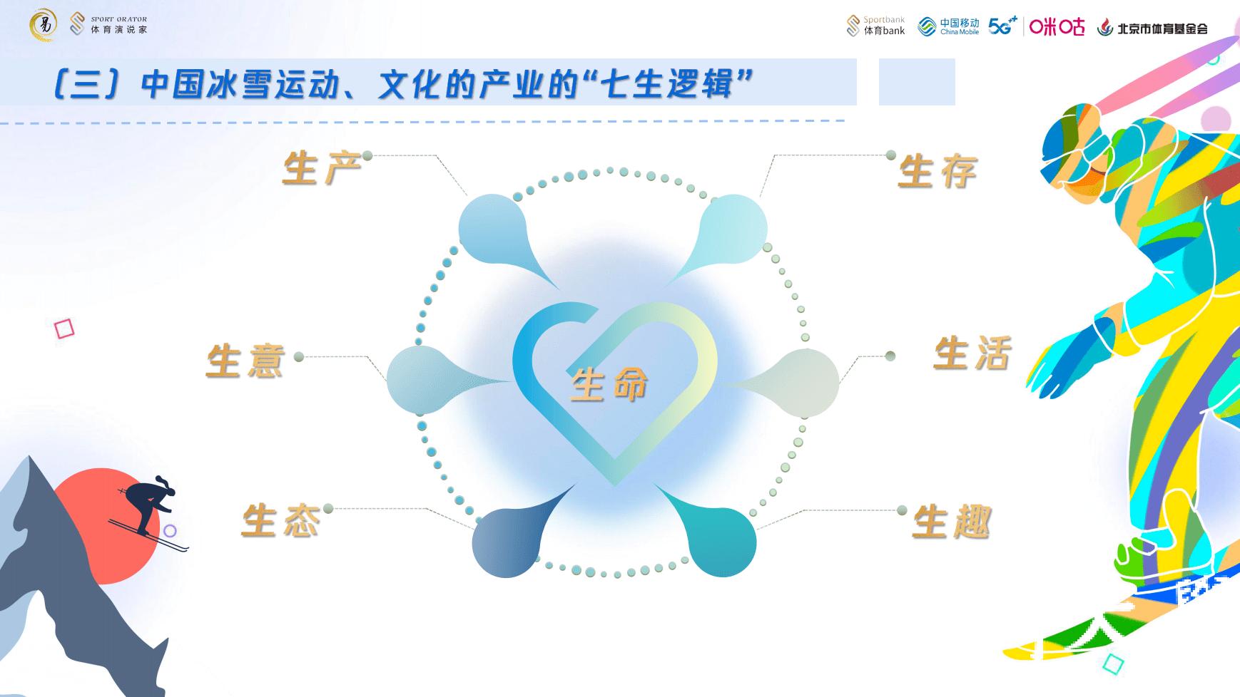 他认为相关顶层设计和对冰雪文化发展的政策引导与支持,为冰雪产业链的发展奠定了良好的基础。但冰雪运动、产业、文化是个复杂系统,他开创性提出中国冰雪运动、文化产业的“七生逻辑”,要推动冰雪产业持续健康发展,多渠道推广冰雪文化,带动冰雪运动参与。