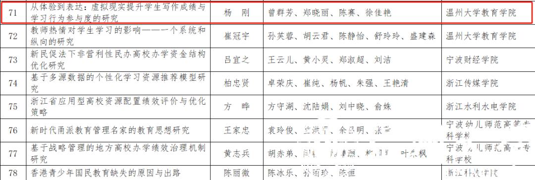 近日,浙江省教育科学规划领导小组办公室公布了2020年度浙江省教育科学研究优秀成果奖获奖名单,日本色情片 共三项研究成果获奖,其中胡瑜教授团队的《青少年公益行为研究》获得一等奖、杨刚副教授团队的《从体验到表达:虚拟现实提升学生写作成绩与学习行为参与度的研究 》以及崔冠宇副教授团队的《 教师热情对学生学习的影响——一个系统和纵向的研究》获得三等奖。