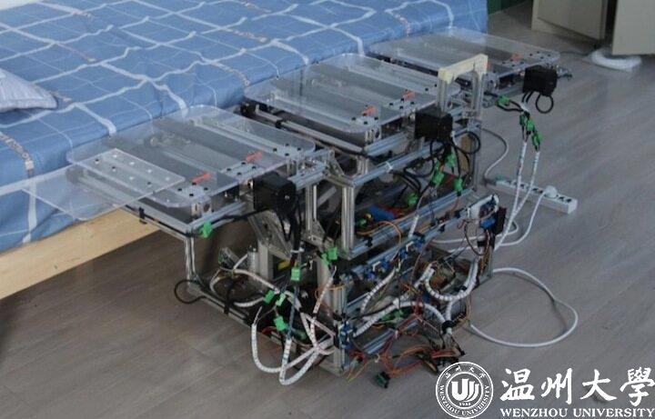 从2019年9月开始,这群小伙子就开始躲进了学校实验室里,聊想法聊结构设计,还要计算一大堆的数据。经过一年的捣鼓,雏形出来了。这一装置从外表上看是个轮椅,老人需要上下床了,一按按键,轮椅就慢慢平伸、再抬高,将老人送到床边。“但能不能再有一个环节是可以将老人送到床上的?让他们再方便一些。”小伙子们尝试了好多个装置却都不满意,正当他们有些气馁的时候,副院长姜锐给他们指出了一个有趣的点子——叉车上不是有一个悬臂梁吗?作用也是为了转移物体。短短一句话,男生们都笑了,困扰了很久的难题一下子就得到了解决。