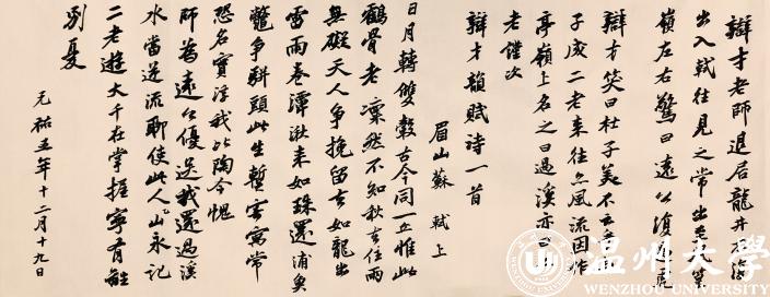 打开历史的卷轴,在清正古雅的瓯越大地上,有着深厚的山水诗情与书画艺术文脉。温州古为永嘉郡,至今已有2200多年的建城史,是历史悠久的东南名邑,山水清远,文风鼎盛,有“东南小邹鲁”之称。温州书画历史底蕴深厚,代有名家,著名者如唐之张諲,元之黄公望、王振鹏,明之黄养正、谢庭循、姜立纲,清之孙诒让等。自晚清民国以来的百年中,温州书画界更是人才辈出,其中马公愚、方介堪、方去疾等影响尤为突出,是海派文化的重要人物,培养了大批书法篆刻名家。