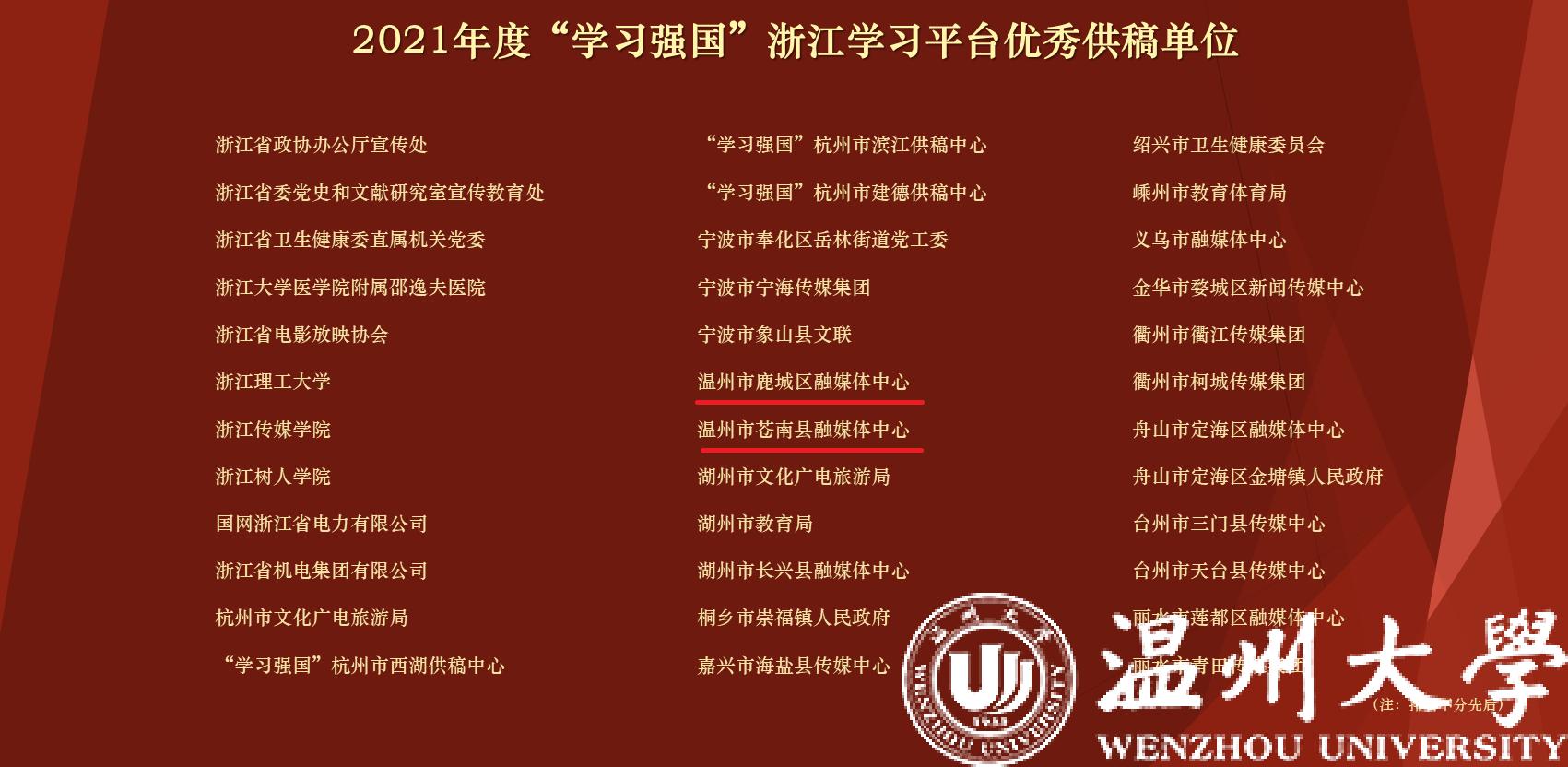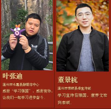 在此前公布的2021年度“学习强国”浙江学习平台优秀供稿单位和优秀供稿员名单中,温州市鹿城区融媒体中心、温州市苍南县融媒体中心获优秀供稿单位;温州市永嘉县融媒体中心叶张迪、温州市泰顺县委宣传部董景杭获优秀供稿员。