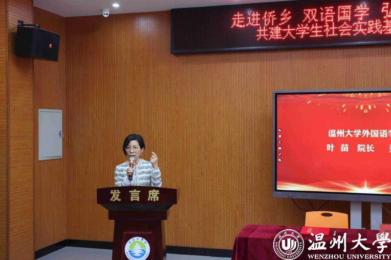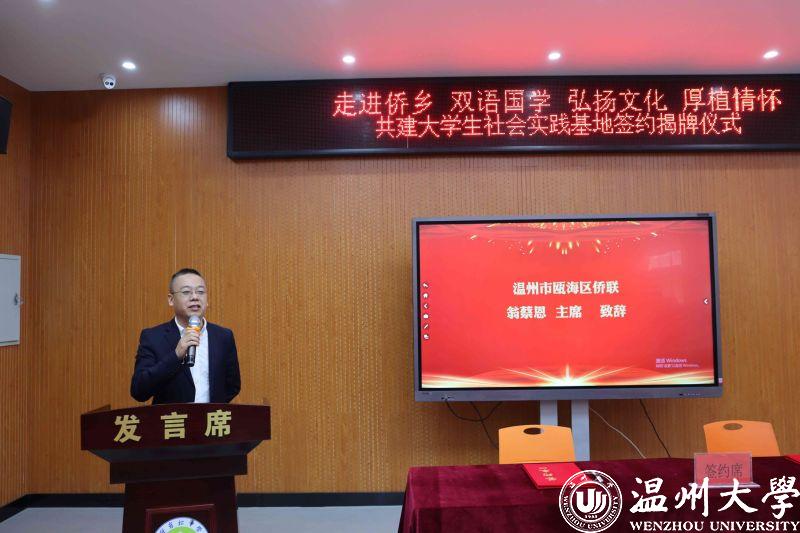 温州市瓯海区侨联主席翁蔡恩对此次签约揭牌工作表达了祝贺。在介绍了温州侨乡的相关情况后,翁主席着重强调了本次共建的渊源以及深刻意义,表达了对外国语学院各位领导、老师的感谢,期望更多优秀大学生参与到国学教育、志愿服务中。