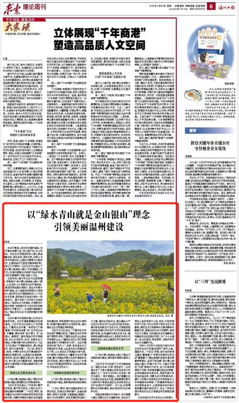 这些年来,温州牢记总书记殷殷嘱托,积极践行“绿水青山就是金山银山”理念,立足自然山水资源和生态环境优势,以美丽田园创建为突破口,结合乡村振兴“两带”建设,全力将美丽田园转化为美丽经济,温州的生态环境持续向好,人与自然关系和谐,美丽经济已经成为温州一张亮丽名片。温州市第十三次党代会报告中提出,“坚持生态文明建设,打造美丽中国温州样板”将是温州市今后五年的战略举措和工作重点之一,这是温州继续践行“两山”理念和牢记总书记殷殷嘱托的鲜明体现。