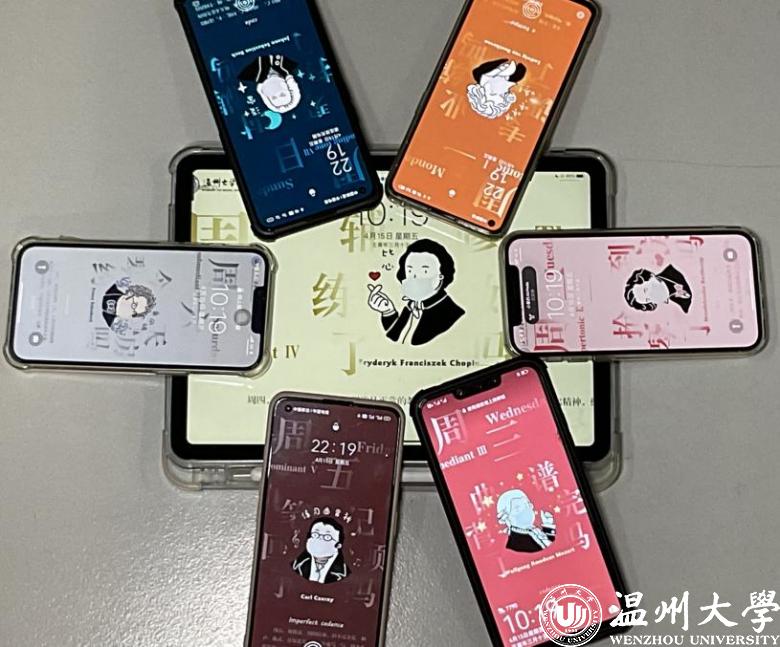 这组壁纸由音乐学院、艺路思政工作室师生集思广益,分工合作,共同完成。壁纸具有独创性,同时与当下防疫、防诈等热点内容相结合,一经推出,深受广大音乐学子的喜爱,每天都有学生“催更”。