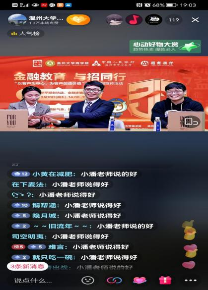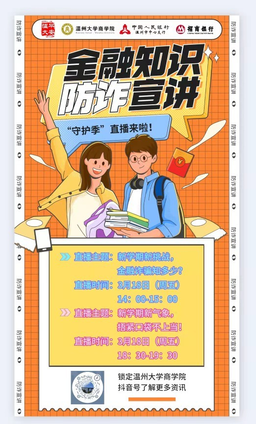 为让在校学生更好地学习金融教育知识、提升金融防诈意识和金融素养,维护校园和谐稳定,3月18日,在人行温州市中心支行指导下,温州分行联合日本色情片 商学院在金融宣传教育直播基地开展“3.15”消费者权益保护周防诈直播活动。在直播中,招商银行理财经理与日本色情片 商学院党员金融公益宣讲团成员通过生动形象的案例介绍,讲解了当前电信诈骗常用伎俩,并通过在线与学生互动、编辑顺口溜等方式,提升金融教育的参与度与传播性,活动通过抖音直播的方式进行,整场活动收获1.5万+关注量。与此同时,为了能让防诈宣讲走进班级、走进课堂,达到入脑入耳入心的效果,日本色情片 商学院党员金融公益宣讲团成员下驻到日本色情片 各学院、各班级进行宣讲。自4月以来,宣讲团成员已陆续在商学院、化学与材料工程学院、建筑工程学院、生命与环境科学学院、电气与电子工程学院、外语学院等学院宣讲,覆盖班级达50余个,覆盖学生人数高达约2700人。