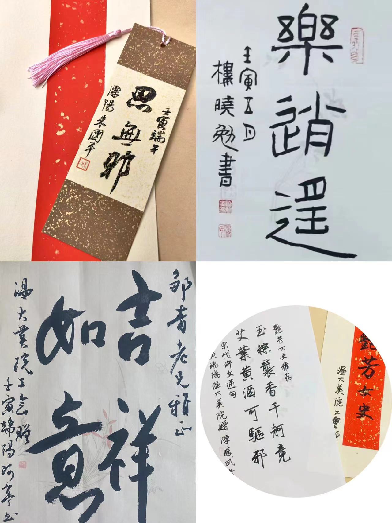 5月28日,为弘扬中华传统文化,营造浓厚的端午文化氛围,温大美院工会邀请楼晓勉、朱国平、黄良珽、陈胜武四位书法老师创作书法小品,定制美院专属端午赠礼。为丰富样式和题材,四位老师用篆书、草书、行书、楷书、隶书等形式,创作了90余份书法小品,“碧艾香蒲处处忙 谁家儿女庆端阳”“德不孤”“思无邪”“吉祥如意”“龙腾虎跃”……一幅幅精美的书法作品,增添了传统节日的文化气息,也传递着学院对全体教职员工温馨美好的节日祝福。收到“盲盒”的老师们兴奋不已,纷纷在微信群、朋友圈中分享这份特别定制的祝福,与家人、朋友共叙端阳情。“幸福感满满,“龙腾虎跃”也是自己对未来的期待吧。”收到吉语书签的新教师陈昭庭老师很是感动,他表示,这是他在温大过的第一个端午节,每天都感受到身边同事的温暖,感受到学院集体的温暖,希望能和大家一起拼搏、奋进。