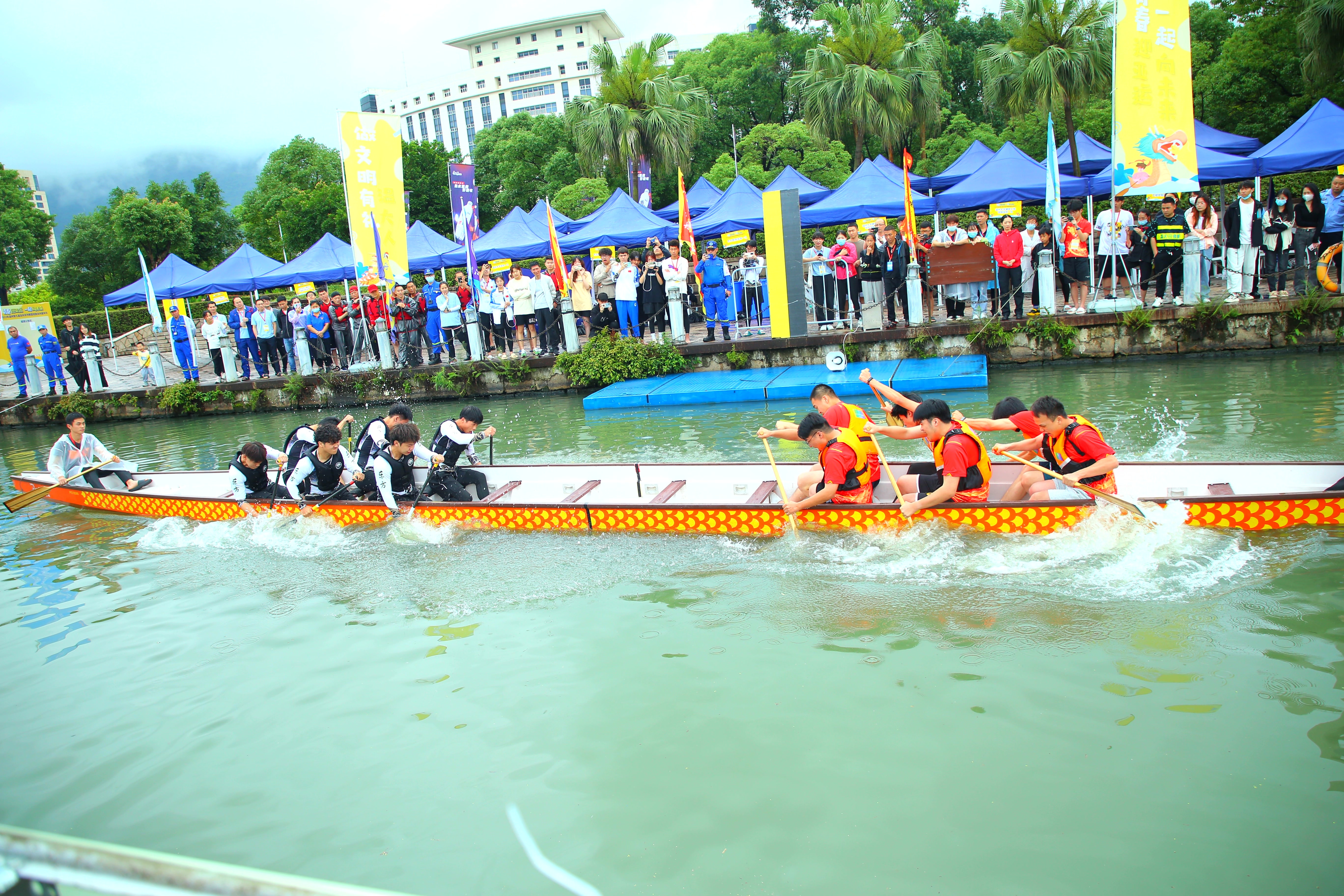 当天下午举行的是独具特色的龙舟拔河赛。龙舟拔河赛于去年高校龙舟嘉年华活动中首度亮相,因其新颖的比赛形式深受参加队伍青睐,大家参与热情高涨。双方人马分别在龙舟上相向而坐,哪一方先到达比赛规定的地点,就为获胜方。一场别开生面的拔河赛就此上演。经过激烈角逐,最终东方职院二队和温大一队获得一等奖。