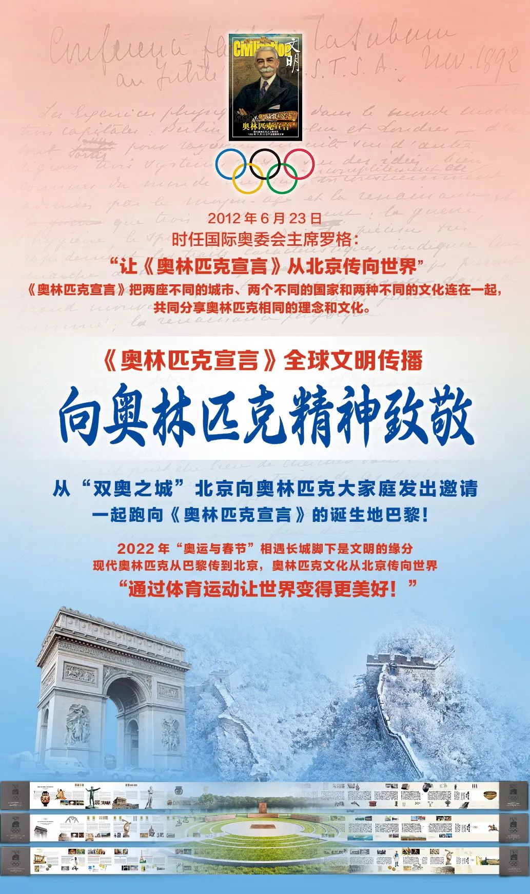 在国际奥委会的指导下,“双奥之城”北京为了促进奥林匹克文化传播和加强中法人文交流,2022年6月23日国际奥林匹克日由首都文明工程基金会和《文明》杂志社联合北京体育大学、新京报、微博体育、腾讯体育、悦跑圈及《北京奥林匹克公园》杂志等有关机构携手推出“《奥林匹克宣言》全球文明传播第四阶段系列活动,让全世界青年携手,跑向法国巴黎:向奥林匹克精神致敬!”