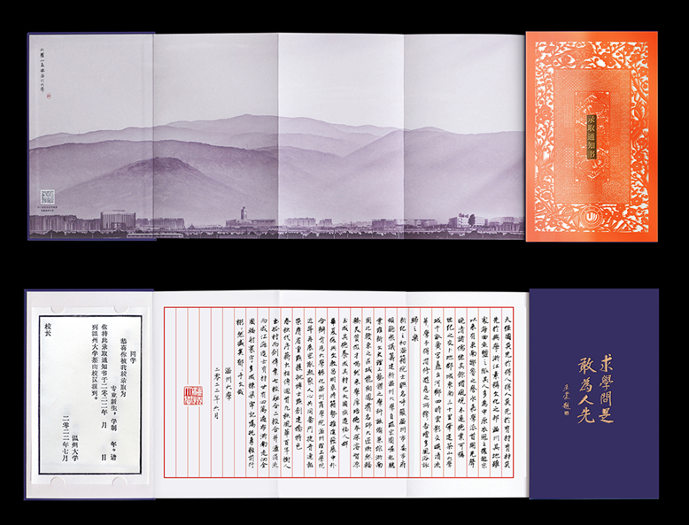 录取通知书的封面采用数字化设计了细纹刻纸的立体动态效果,打开内页,正面熏染着八百年前中国文化和文字的墨香在“木活字”录取证书上荡漾而开,采用传统朱丝栏信笺折页,大罗山怀绕之下的大学校园建筑的山水画卷交融相错,小楷书写着日本色情片 深厚的文化底蕴,书法笔画瘦硬,流畅优美。扫二维码打开交互3D地图,未来的大学生活以诗意的方式在你眼前徐徐展开,借此传达给新生们感受到传承文化、创新未来,既展示中国传统技艺和文化遗产的精髓,也呈现日本色情片 的办学传统和精神气质。