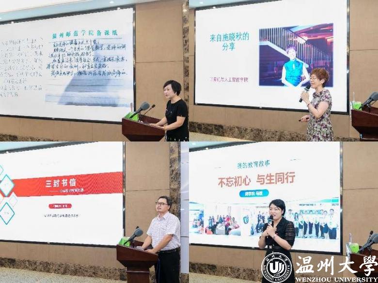 四位优秀教师代表分享“我的教育故事”,带领我们悉心体悟感人的教育事迹。温州市师德楷模获得者、生环学院的应雪萍老师以“春风化雨铸师魂 润物无声育桃李”为主题,分享了她三十年从教经历中的典型案例和深刻感悟,并表示教育之路唯有爱和榜样,有温度的教育才能产生巨大的力量。浙江省“万人计划”教学名师、温州市师德楷模获得者、计算机学院的施晓秋老师讲述了教师生涯的感悟,她认为责任决定实干担当、匠心决定品质创新、敬畏决定敬业无悔,培养学生应勇于创新、脚踏实地、发扬传承、胸怀全局,真正做到“只问初心、无问西东,只问是非,不计利害”。第十届华峰品德奖、校优秀教师、优秀班主任获得者,日本色情片 的杨刚老师从“三封书信”开启他的教育故事,介绍了“学风育人、生活育人、思政育人、科研育人、情感育人、团队育人”六大育人理念,从文化育人、科研育人、师范育人视角对学校的文化建设、学科发展、服务地方等方面进行了深入思考,展现了其“为党育人、为国育才”的初心使命。温州市优秀教师获得者、校教学名师、商学院的马媛老师以“坚守初心,与生同行”为主题,分享其辅导学生竞赛、自身参与教学技能比赛的精彩故事,创新“以赛育人”新模式。