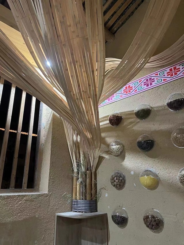 在整个的空间设计中,从想法到实践落地,不论大小,团队成员们都亲力亲为,从剪竹编、画竹编、贴竹编,到一整面墙的墙绘完工,景观竹筒灯等等,都是由成员们手工打磨,手工裁剪。爬铁架、拧螺丝、打磨、切割,原材料,河里找石头、山上砍竹子等,这一切都来自成员们在不断实践过程中得到了最终的结果。