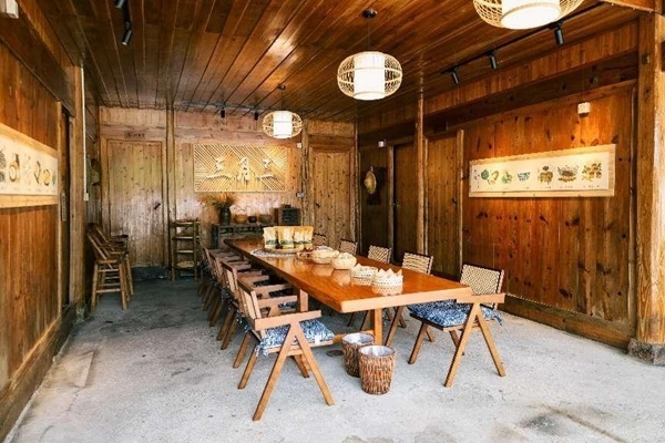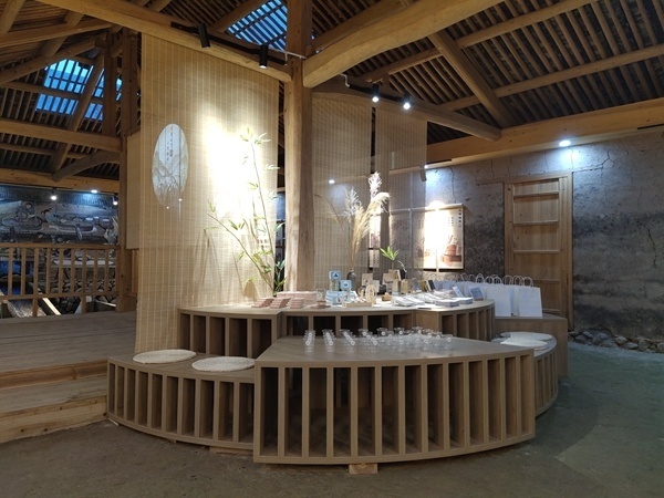在设计过程中,团队围绕“为村里村民服务,提高群众幸福感,创造共享空间”的理念,在对场地进行分析后,决定保留原有装修,体现可持续性发展的自然风格,同时提炼竹、畲服、书香、茶等元素,进行融合和创新。考虑到空间的商业性质,团队还计划在此售卖当地特色茶饮糕点“三杯香”,并为此设计了配套的包装与IP形象。施工过程中,团队用新功能植入、增加新的照明方式、采用本土自然的建筑材料、墙壁采用彩色涂料增加时尚感。用“九鱼”木雕迎宾,象征幽皇里海纳百川、百姓生活兴旺;用国学大师的故事和绘画装饰空间,平添书卷和文化气韵。用家具、广告灯、抱枕和绿植等陈设品点缀空间,让空间变保舒适且更具人性化。