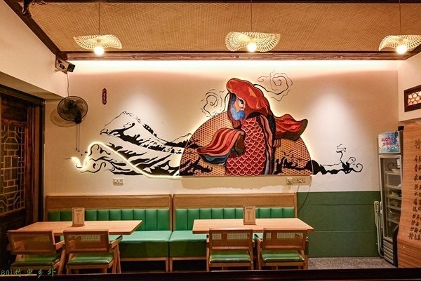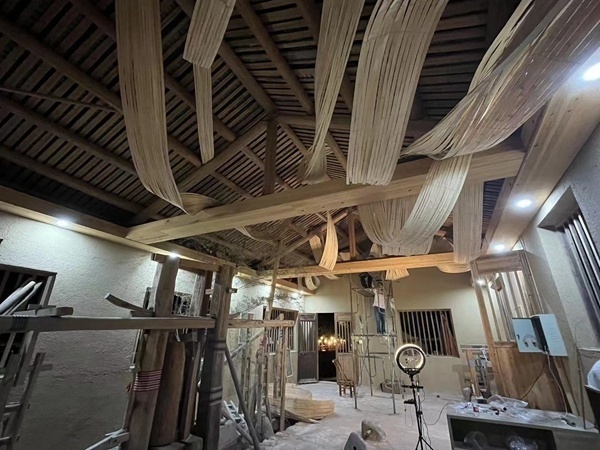 眼下,竹里乡外空间改造接近尾声,改造效果却已然出现。在竹里乡外门口,一群游客品尝着当地小吃,连连称赞。进入店内,墙面锦鲤的设计映入眼帘,团队负责人介绍,这正是符合了竹里乡外的主打菜品鱼。也寓意着富贵吉祥、幸福健康。改造过程中,团队充分结合当地畲族元素。在二楼包厢墙面,团队成员们手绘创作,融合了当地畲族女子及服饰、畲族的凤凰。包厢吊顶利用竹编,以二纹八编的形式,再加上另外一种竹纹下坠进行藏青色凤纹布包边与桌布协调,最后形成。团队成员们还用上山砍来的毛竹,分别进行切割、刷油、摆放,形成错落美感,内里安装灯带打光。