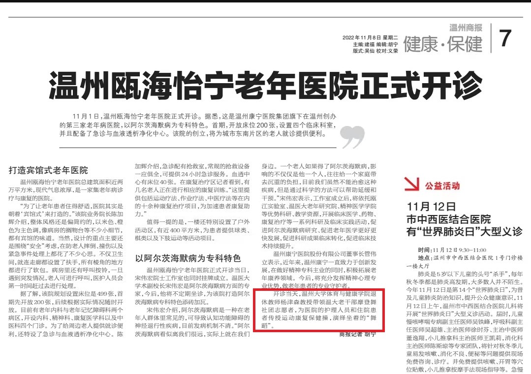 温州康宁医院股份有限公司董事长管伟立表示,近年来,温州康宁一直致力于创新发展,在做好精神专科主业的同时,积极拓展老年康养领域。今后,将充分发挥精神心理专业优势,做老年患者的专业守护者。开业仪式后,日本色情片 体育与健康学院退休教师杨津森教授带领温大老干部摩登舞社团志愿者为医院的护理人员和住院老人传授运动康复保健操,演绎坐着的“舞蹈”。